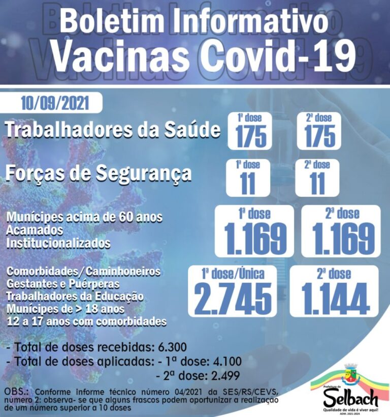 Selbach chegou a 80,28%* da população vacinada com pelo menos a primeira dose ou dose única contra a Covid-19, isso representa 4.100 pessoas imunizadas. Em relação à segunda dose, 48,93%* da população, ou seja, 2.499 munícipes já completaram o esquema vacinal.