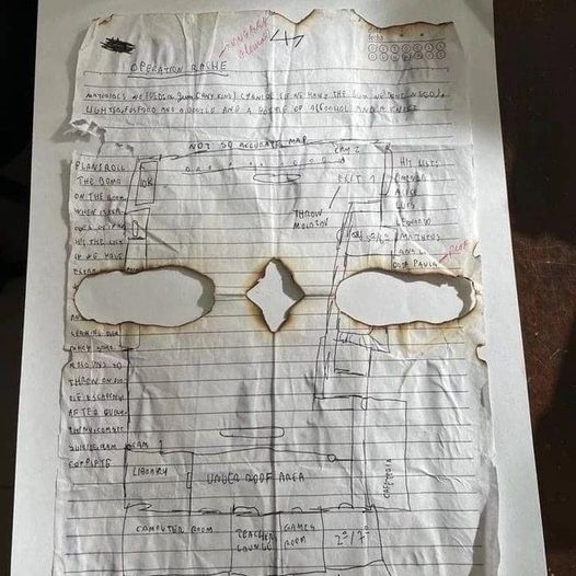 O autor teria feito uma espécie de planta da escola, com a localização e sentido das dependências, entradas e saídas da escola, localização de câmeras e sala dos professores.