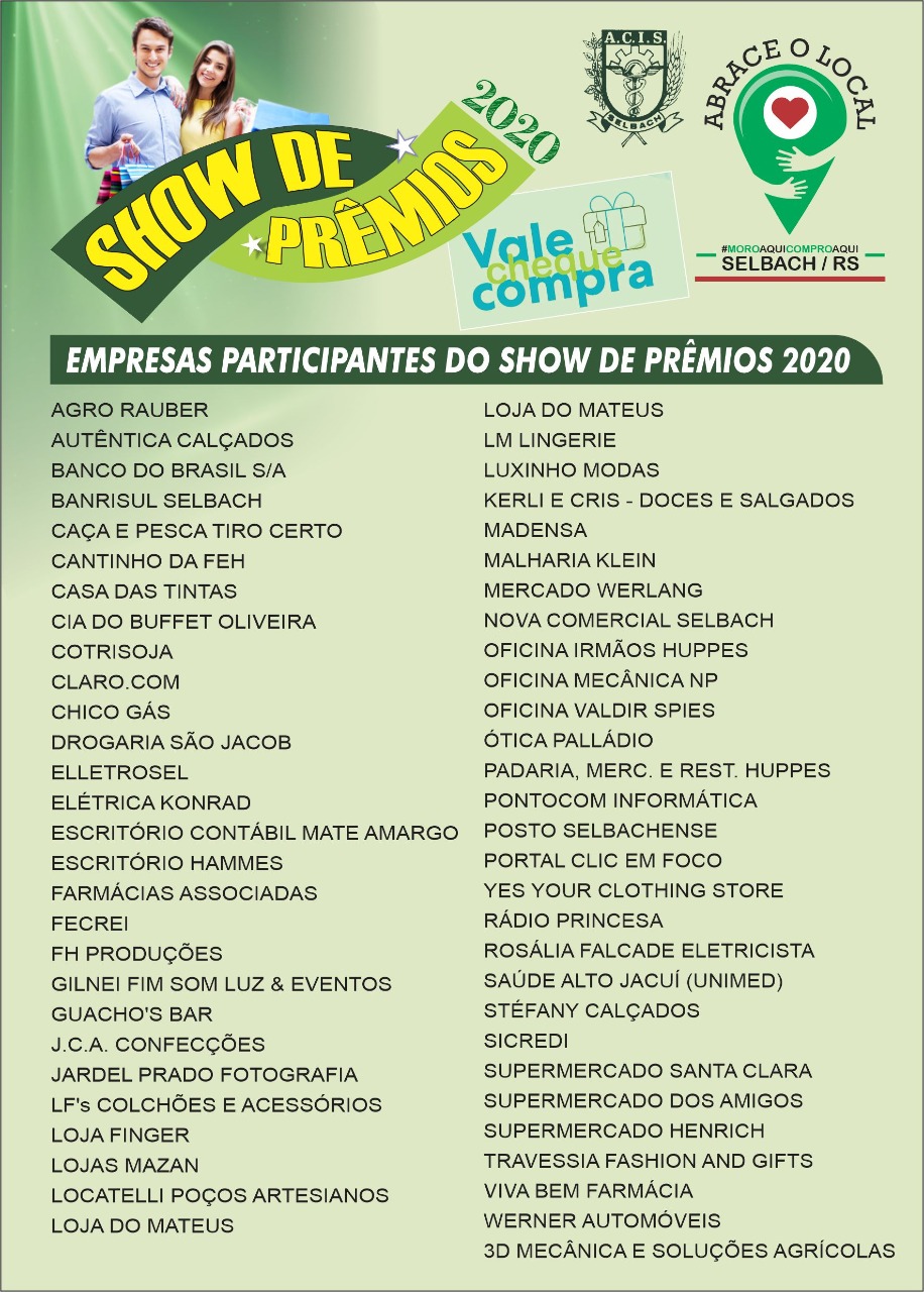 Hoje, 28/12/2020, teremos o último sorteio do Show de Prêmios da ACIS, na Prefeitura Municipal as 16 horas. Traga o seu cupom na ACIS, Prefeitura ou nas lojas associadas.