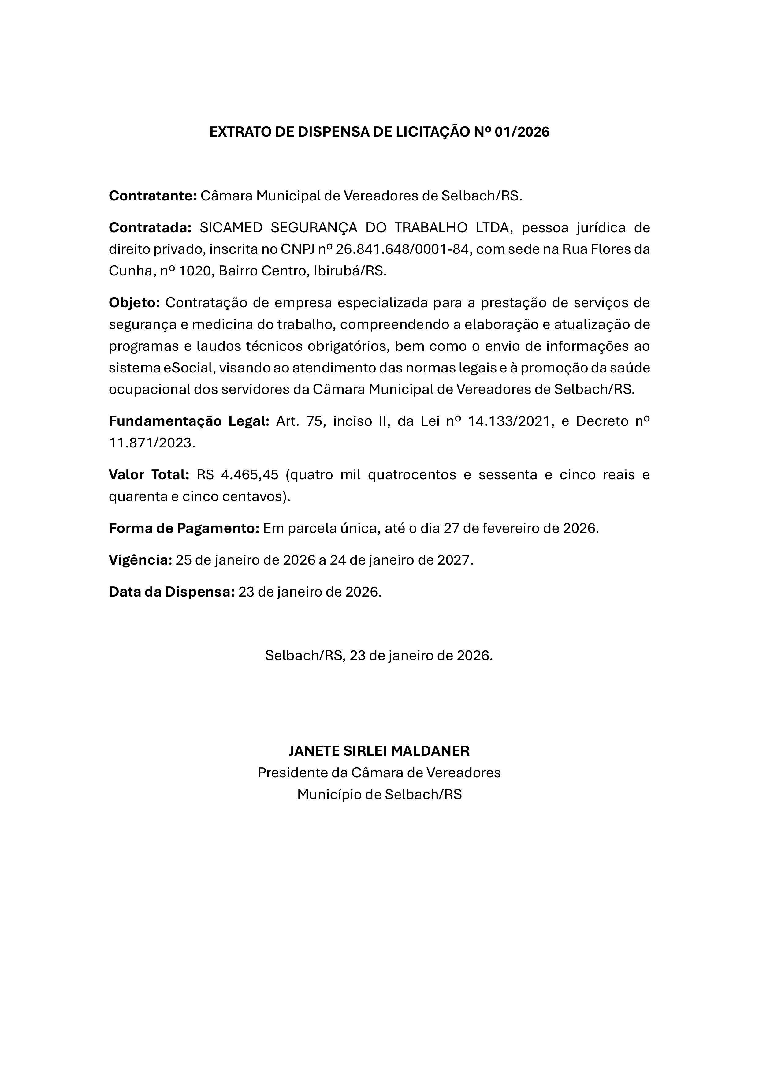 CÂMARA DE VEREADORES DE SELBACH: EXTRATO DE DISPENSA DE LICITAÇÃO Nº 01/2026