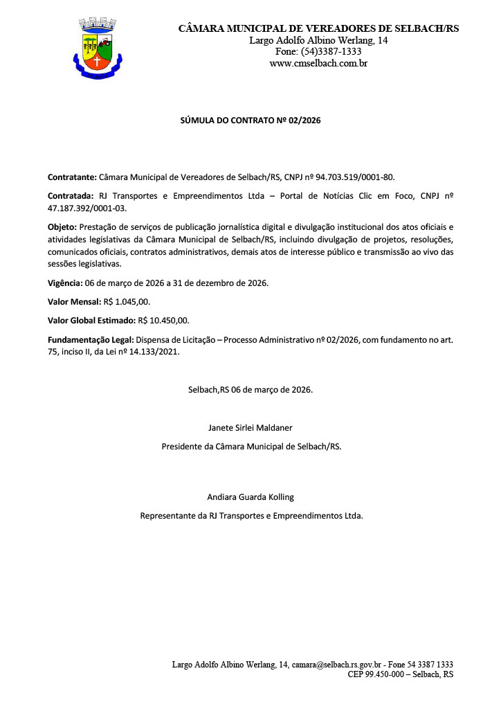 CÂMARA DE VEREADORES DE SELBACH: SÚMULA DO CONTRATO DE PRESTAÇÃO DE SERVIÇOS Nº 02/2026