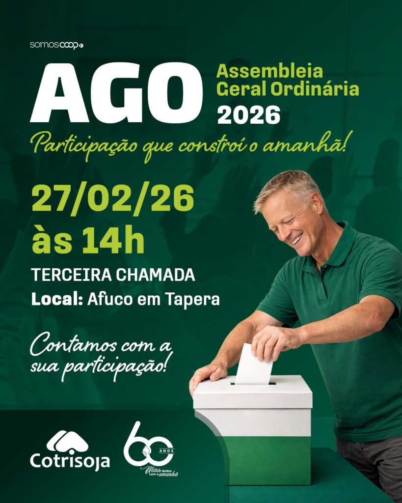 Convidamos você para nossa AGO – Assembleia Geral Ordinária, que irá acontecer na sexta-feira, 27/02, às 14h na sede da Afuco em Tapera