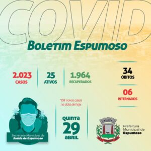 O boletim epidemiológico Covid-19 da Secretaria Municipal de Saúde, de hoje (29/04), a cidade registrou 08 novos casos.