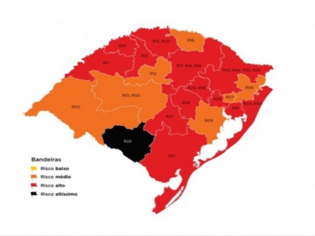 A situação do Estado perante o coronavírus ainda requer muita atenção. São 13 as regiões em bandeira vermelha (risco epidemiológico alto). Em bandeira laranja, que representa risco médio, estão sete regiões – Santa Maria, Uruguaiana, Taquara, Novo Hamburgo, Guaíba, Cruz Alta e Erechim. As duas que não aderiram ao sistema de cogestão – Guaíba e Uruguaiana – estão em bandeira laranja nesta rodada.