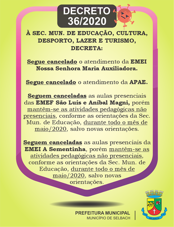 Confira o DECRETO na íntegra, acesse: https://www.selbach.rs.gov.br/pt_BR/decretos