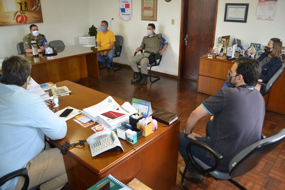 Reunião aconteceu na manhã do dia 12/05. Ficou reiterado o apoio das forças de segurança para a implementação dos Decretos Estadual e Municipal quanto à situações de aglomerações de pessoas, seja em estabelecimentos, jogos esportivos, encontros religiosos, etc. ou qualquer outro descumprimento das normativas determinadas.