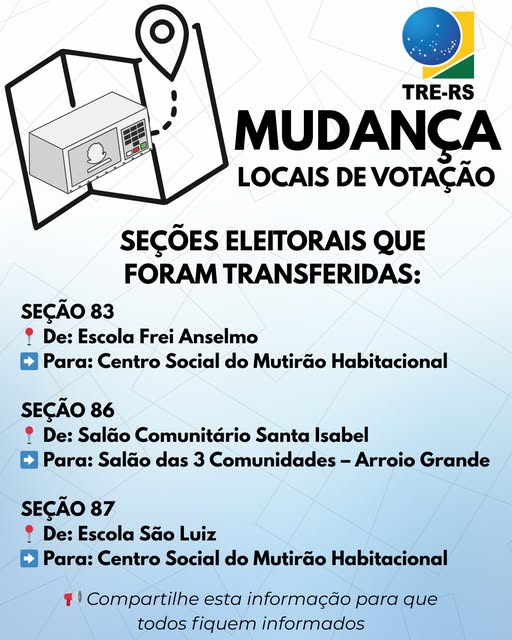 Pedimos a atenção dos eleitores dessas comunidades para que verifiquem o novo local de votação.