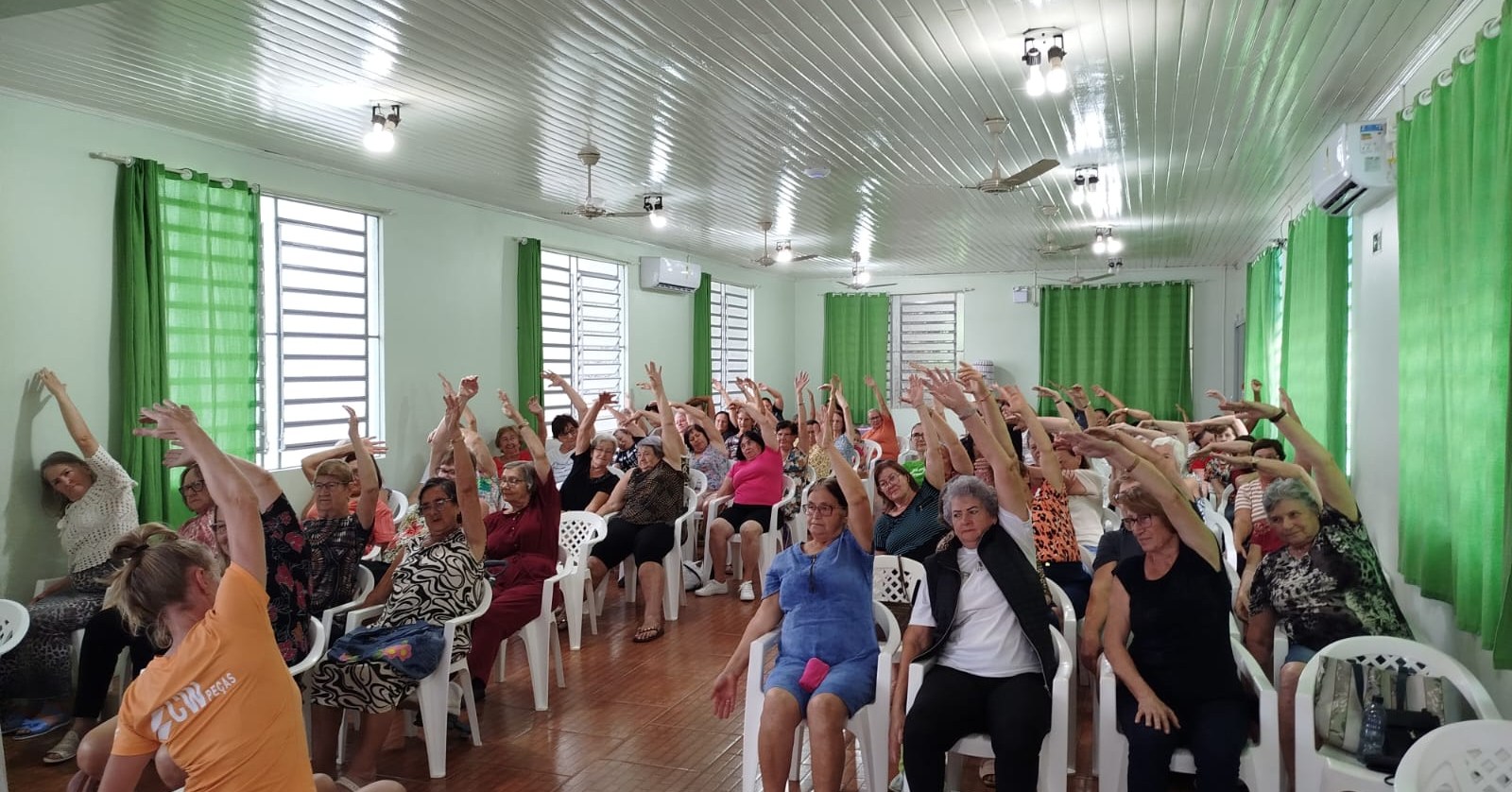 Na sequência, a professora de Educação Física, Verônica, conduziu alongamentos e exercícios, com práticas simples que podem ser feitas em casa, ajudando na circulação e no bem-estar.
