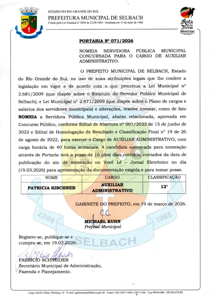 SELBACH – Portaria nº 071 – Nomeação Auxiliar Administrativo